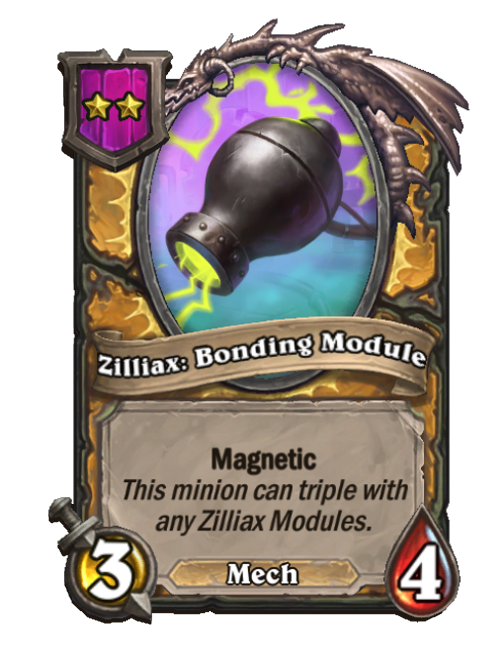 Zilliax: Bonding Module is a Tier 2 Mech Minion in Hearthstone Battlegrounds with 3/4 stats featuring Magnetic. Effect: Magnetic This minion can triple with any Zilliax Modules. This card is no longer in the pool (Legacy).
