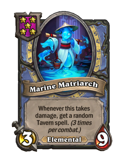 Marine Matriarch is a Tier 5 Elemental Minion in Hearthstone Battlegrounds with 3/9 stats. Effect: Whenever this takes damage, get a random Tavern spell. (3 times per combat.). This card is no longer in the pool (Legacy).