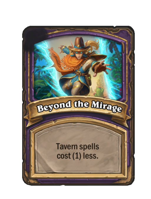 Beyond the Mirage is a Reward in Hearthstone Battlegrounds. Effect: Tavern spells cost (1) less.