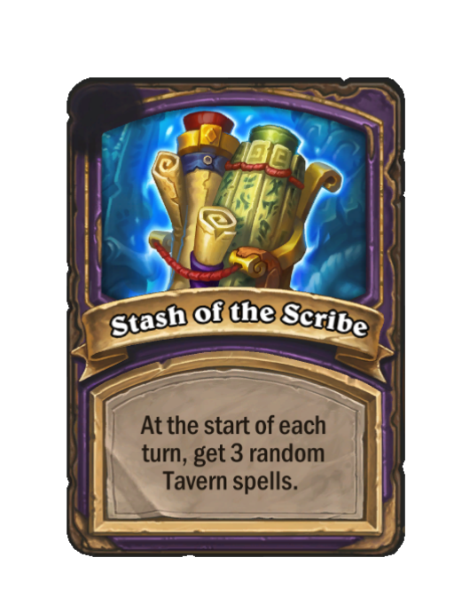 Stash of the Scribe is a Reward in Hearthstone Battlegrounds featuring Start of Turn. Effect: At the start of each turn, get 3 random Tavern spells.