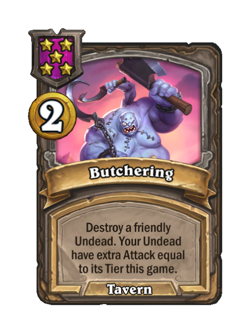 Butchering is a Tier 5 Spell in Hearthstone Battlegrounds (Tavern). Effect: Destroy a friendly Undead. Your Undead have extra Attack equal to its Tier this game. Costs 2 Gold. This card is no longer in the pool (Legacy).