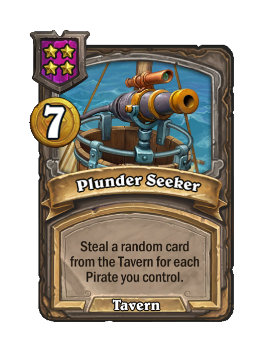 Plunder Seeker is a Tier 4 Spell in Hearthstone Battlegrounds (Tavern). Effect: Steal a random card from the Tavern for each Pirate you control. Costs 7 Gold. This card is no longer in the pool (Legacy).