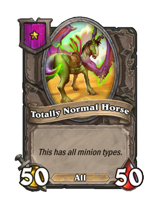 Totally Normal Horse is a Tier 1 All Minion in Hearthstone Battlegrounds with 50/50 stats. Effect: This has all minion types. Created by: Stable Amalgamation. This card is no longer in the pool (Legacy).