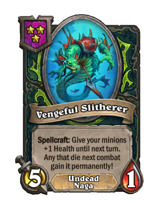 Vengeful Slitherer is a Tier 3 Naga/Undead Minion in Hearthstone Battlegrounds with 5/1 stats. Effect: Spellcraft: Give your minions +1 Health until next turn. Any that die next combat gain it permanently!. This card is no longer in the pool (Legacy).