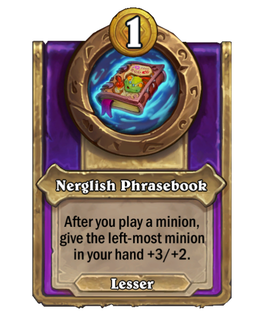 Nerglish Phrasebook is a Trinket in Hearthstone Battlegrounds. Effect: After you play a minion, give the left-most minion in your hand +3/+2.