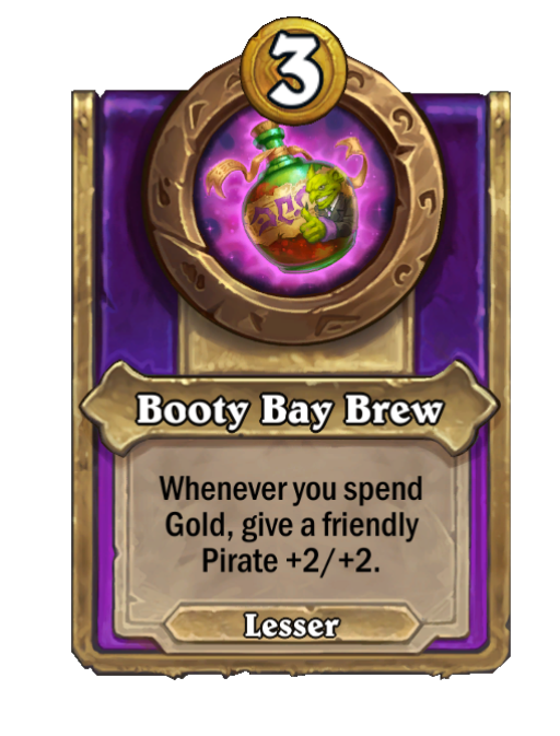 Booty Bay Brew is a Trinket in Hearthstone Battlegrounds. Effect: Whenever you spend Gold, give a friendly Pirate +2/+2.