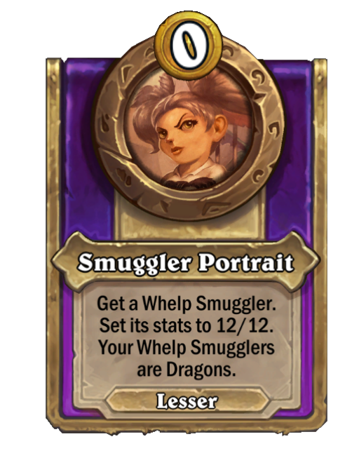 Smuggler Portrait is a Trinket in Hearthstone Battlegrounds. Effect: Get a Whelp Smuggler. Set its stats to 12/12. Your Whelp Smugglers are Dragons. This card is no longer in the pool (Legacy).
