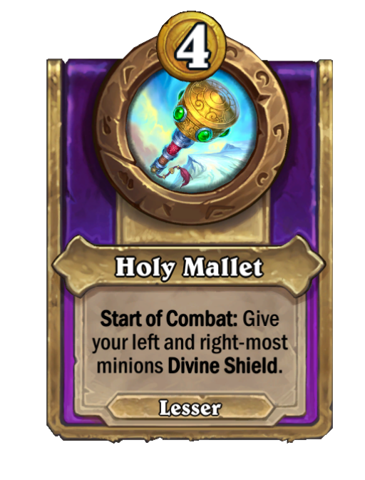 Holy Mallet is a Trinket in Hearthstone Battlegrounds featuring Start of Combat. Effect: Start of Combat: Give your left and right-most minions Divine Shield.