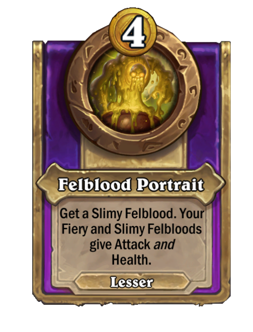 Felblood Portrait is a Trinket in Hearthstone Battlegrounds featuring Aura. Effect: Get a Slimy Felblood. Your Fiery and Slimy Felbloods give Attack and Health. This card is no longer in the pool (Legacy).