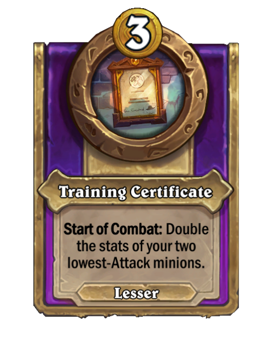 Training Certificate is a Trinket in Hearthstone Battlegrounds featuring Start of Combat. Effect: Start of Combat: Double the stats of your two lowest-Attack minions. This card is no longer in the pool (Legacy).