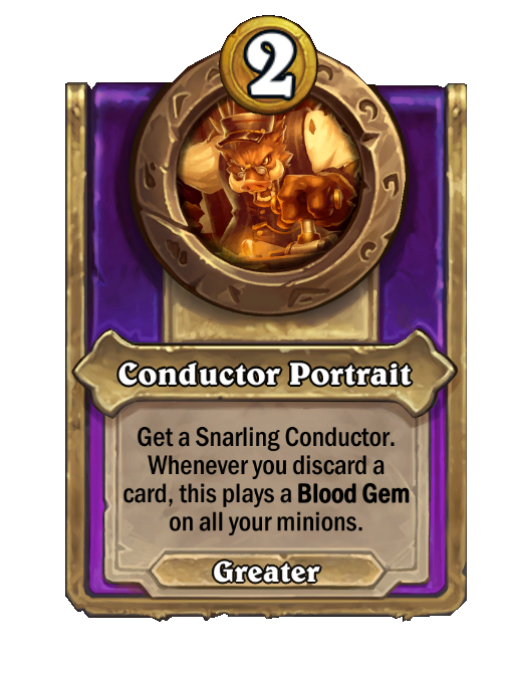 Conductor Portrait is a Trinket in Hearthstone Battlegrounds. Effect: Get a Snarling Conductor. Whenever you discard a card, this plays a Blood Gem on all your minions. This card is no longer in the pool (Legacy).