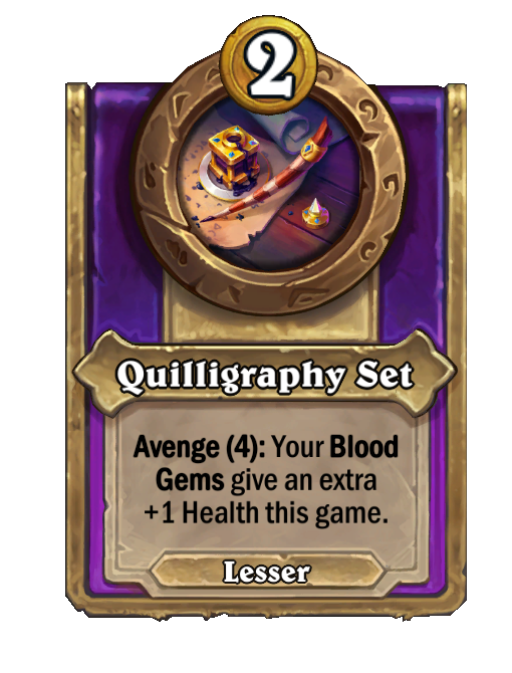 Quilligraphy Set is a Trinket in Hearthstone Battlegrounds featuring Avenge. Effect: Avenge (4): Your Blood Gems give an extra +1 Health this game.
