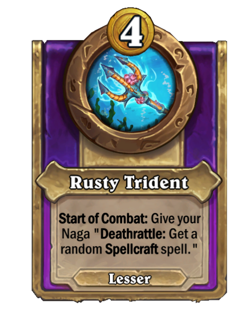 Rusty Trident is a Trinket in Hearthstone Battlegrounds featuring Start of Combat. Effect: Start of Combat: Give your Naga "Deathrattle: Get a random Spellcraft spell.".