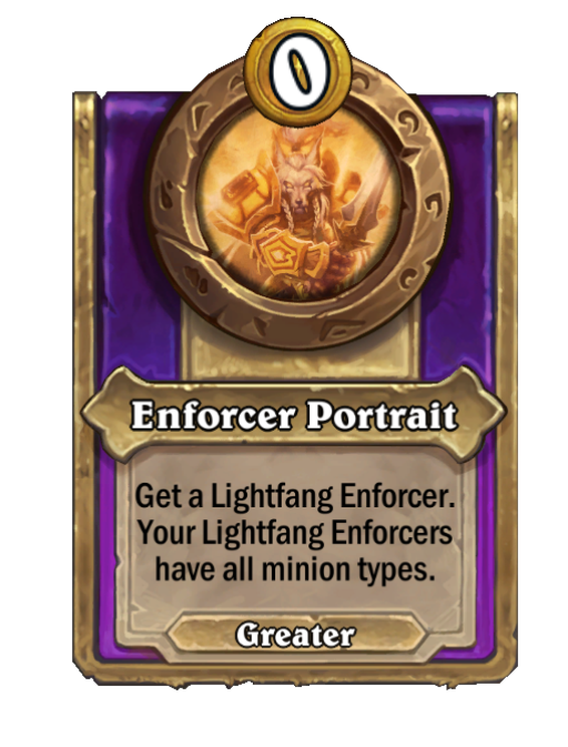 Enforcer Portrait is a Trinket in Hearthstone Battlegrounds featuring Aura. Effect: Get a Lightfang Enforcer. Your Lightfang Enforcers have all minion types. This card is no longer in the pool (Legacy).