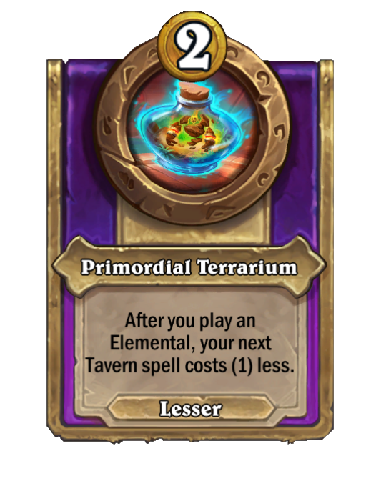 Primordial Terrarium is a Trinket in Hearthstone Battlegrounds. Effect: After you play an Elemental, your next Tavern spell costs (1) less. This card is no longer in the pool (Legacy).