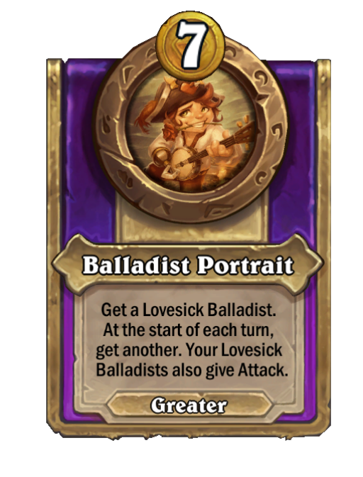 Balladist Portrait is a Trinket in Hearthstone Battlegrounds featuring Aura, Start of Turn. Effect: Get a Lovesick Balladist. At the start of each turn, get another. Your Lovesick __Balladists also give Attack.
