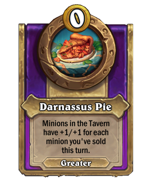 Darnassus Pie is a Trinket in Hearthstone Battlegrounds featuring Aura. Effect: Minions in the Tavern have +1/+1 for each minion you've sold this turn. This card is no longer in the pool (Legacy).