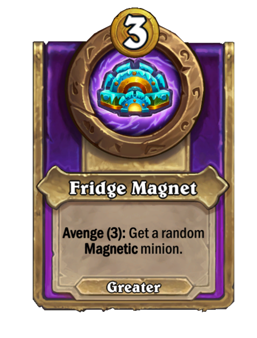 Fridge Magnet is a Trinket in Hearthstone Battlegrounds featuring Avenge. Effect: Avenge (3): Get a random Magnetic minion.