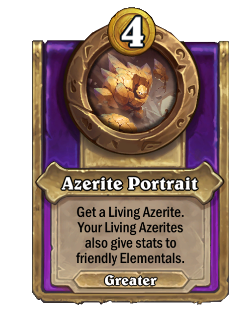 Azerite Portrait is a Trinket in Hearthstone Battlegrounds featuring Aura. Effect: Get a Living Azerite. Your Living Azerites also give stats to friendly Elementals. This card is no longer in the pool (Legacy).