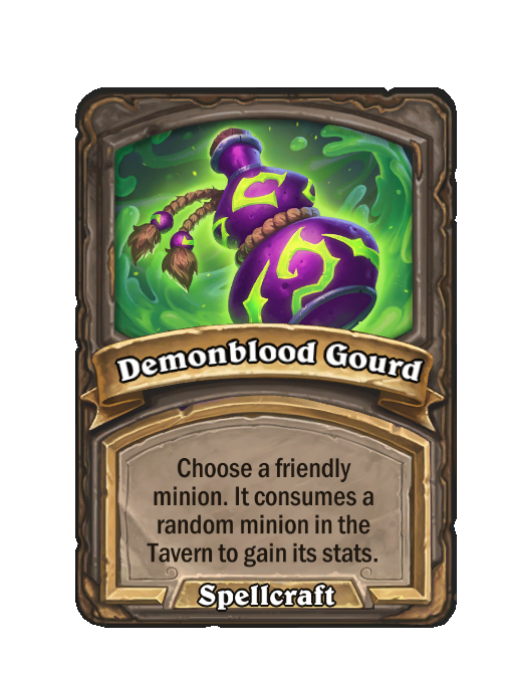 Demonblood Gourd is a Spell in Hearthstone Battlegrounds (Spellcraft). Effect: Choose a friendly minion. It consumes a random minion in the Tavern to gain its stats. Created by: Demonblood Gourd. This card is no longer in the pool (Legacy).
