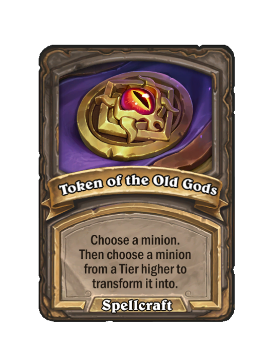 Token of the Old Gods is a Spell in Hearthstone Battlegrounds (Spellcraft). Effect: Choose a minion. Then choose a minion from a Tier higher to transform it into. Created by: Token of the Old Gods.