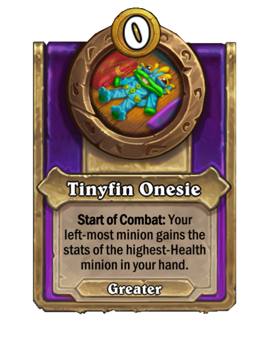 Tinyfin Onesie is a Trinket in Hearthstone Battlegrounds featuring Start of Combat. Effect: Start of Combat: Your left-most minion gains the stats of the highest-Health minion in your hand. This card is no longer in the pool (Legacy).