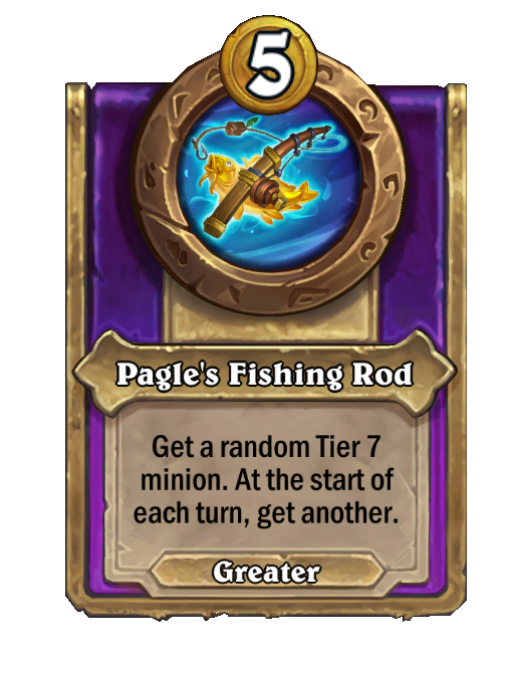 Pagle's Fishing Rod is a Trinket in Hearthstone Battlegrounds. Effect: Get a random Tier 7 minion. At the start of each turn, get another.