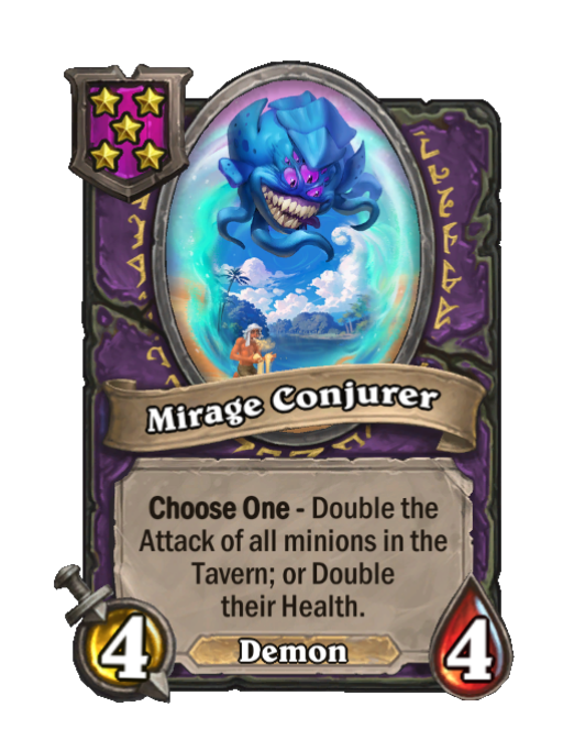 Mirage Conjurer is a Tier 5 Demon Minion in Hearthstone Battlegrounds with 4/4 stats featuring Choose One. Effect: Choose One - Double the Attack of all minions in the Tavern; or Double their Health. This card is no longer in the pool (Legacy).