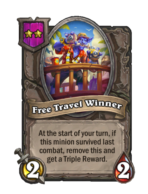 Free Travel Winner is a Tier 2 Minion in Hearthstone Battlegrounds with 2/2 stats featuring Start of Turn. Effect: At the start of your turn, if this minion survived last combat, remove this and get a Triple Reward. This card is no longer in the pool (Legacy).