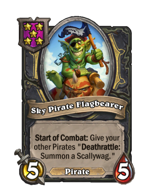 Sky Pirate Flagbearer is a Tier 5 Pirate Minion in Hearthstone Battlegrounds with 5/5 stats featuring Start of Combat. Effect: Start of Combat: Give your other Pirates "Deathrattle: _Summon a Scallywag.". This card is no longer in the pool (Legacy).