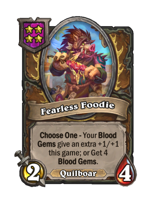 Fearless Foodie is a Tier 4 Quilboar Minion in Hearthstone Battlegrounds with 2/4 stats featuring Choose One. Effect: Choose One - Your Blood Gems give an extra +1/+1 this game; or Get 4 Blood Gems.