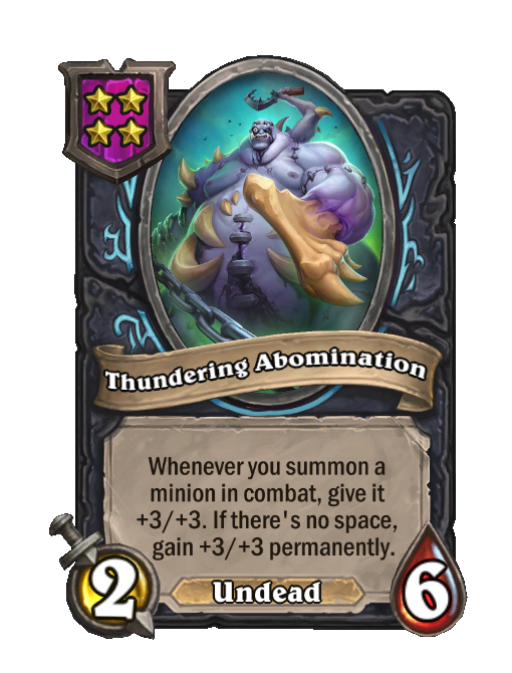 Thundering Abomination is a Tier 4 Undead Minion in Hearthstone Battlegrounds with 2/6 stats. Effect: Whenever you summon a minion in combat, give it +3/+3. If there's no space, _______gain +3/+3 permanently.____. This card is no longer in the pool (Legacy).