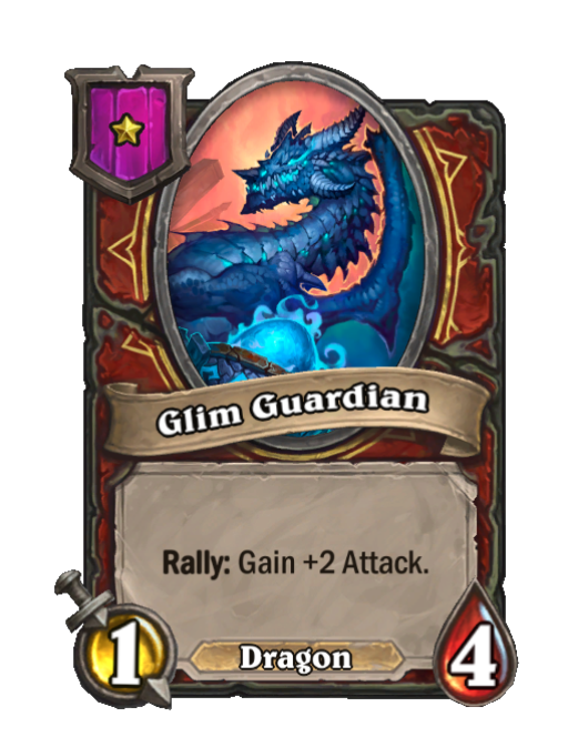 Glim Guardian is a Tier 1 Dragon Minion in Hearthstone Battlegrounds with 1/4 stats featuring Rally. Effect: Rally: Gain +2 Attack. This card is no longer in the pool (Legacy).