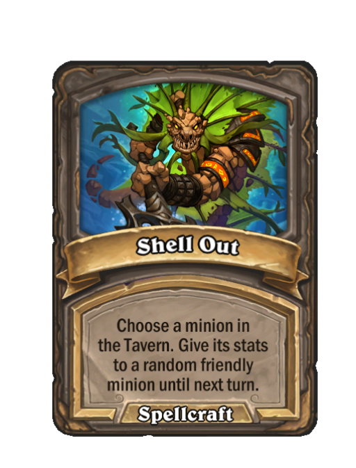 Shell Out is a Spell in Hearthstone Battlegrounds (Spellcraft). Effect: Choose a minion in the Tavern. Give its stats to a random friendly minion until next turn. Created by: Shellemental. This card is no longer in the pool (Legacy).