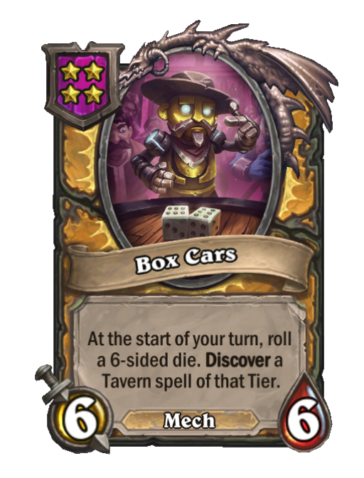 Box Cars is a Tier 4 Mech Minion in Hearthstone Battlegrounds with 6/6 stats featuring Start of Turn, Discover. Effect: At the start of your turn, roll a 6-sided die. Discover a Tavern spell of that Tier. Created by: Snake Eyes.