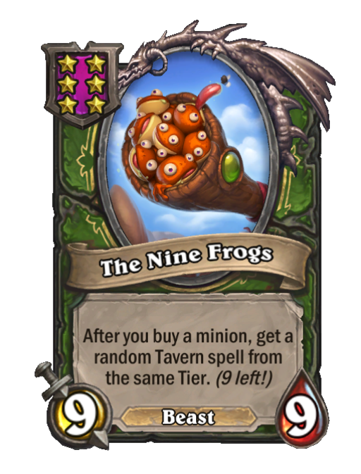 The Nine Frogs is a Tier 6 Beast Minion in Hearthstone Battlegrounds with 9/9 stats. Effect: After you buy a minion, get a random Tavern spell from the same Tier. (9 left!). Created by: Doctor Holli'dae.