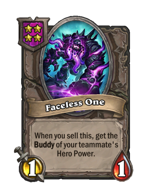 Faceless One is a Tier 4 Minion in Hearthstone Battlegrounds with 1/1 stats. Effect: When you sell this, get the Buddy of your teammate's Hero Power. Created by: The Nameless One.