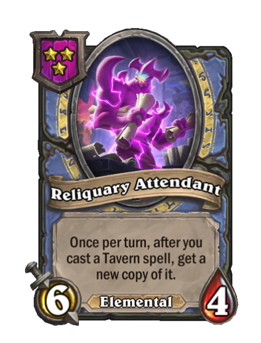 Reliquary Attendant is a Tier 3 Elemental Minion in Hearthstone Battlegrounds with 6/4 stats. Effect: Once per turn, after you cast a Tavern spell, get a new copy of it. Created by: Tae'thelan Bloodwatcher.