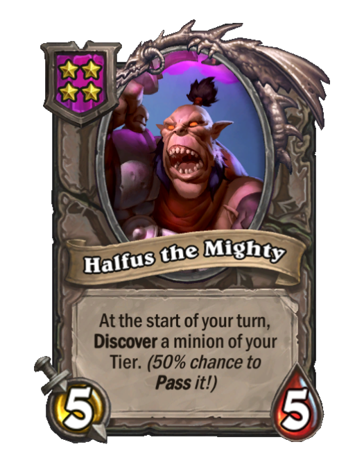 Halfus the Mighty is a Tier 4 Minion in Hearthstone Battlegrounds with 5/5 stats featuring Start of Turn, Discover, Pass. Effect: At the start of your turn, Discover a minion of your Tier. (50% chance to Pass it!). Created by: Cho.
