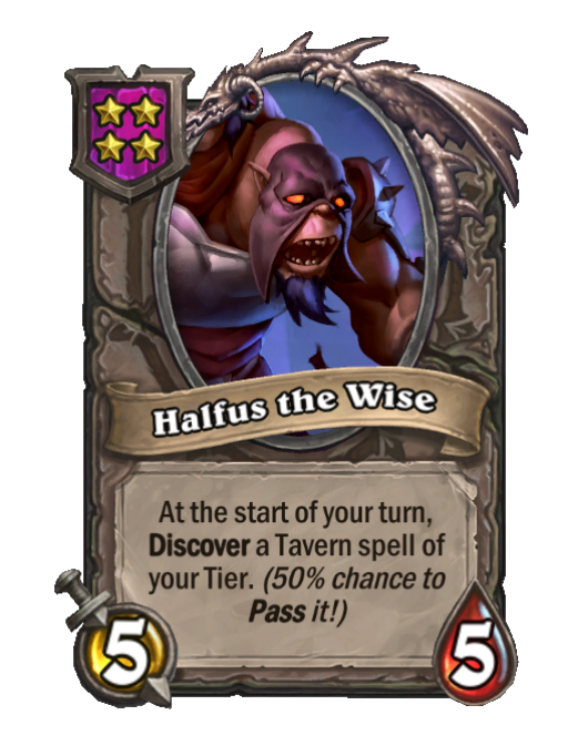 Halfus the Wise is a Tier 4 Minion in Hearthstone Battlegrounds with 5/5 stats featuring Start of Turn, Discover, Pass. Effect: At the start of your turn, Discover a Tavern spell of your Tier. (50% chance to Pass it!). Created by: Gall.