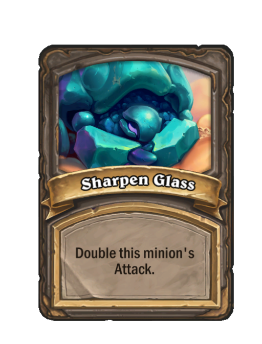 Sharpen Glass is a Spell in Hearthstone Battlegrounds. Effect: Double this minion's Attack. Created by: Sleeping Sea Glass. This card is no longer in the pool (Legacy).
