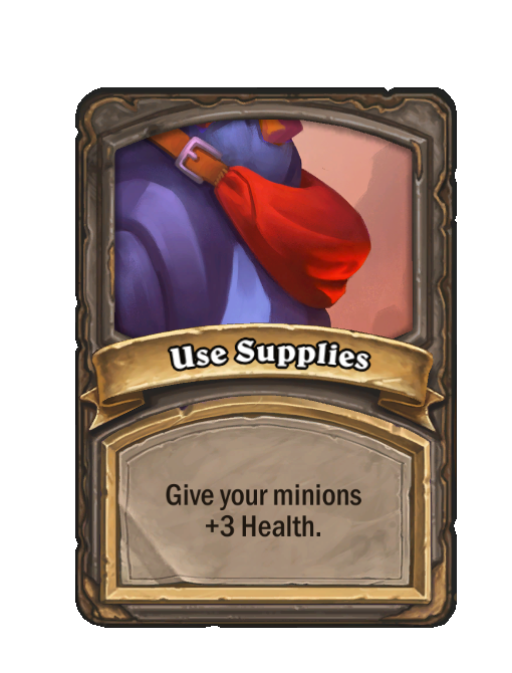 Use Supplies is a Spell in Hearthstone Battlegrounds. Effect: Give your minions +3 Health. Created by: Volcanic Visitor. This card is no longer in the pool (Legacy).