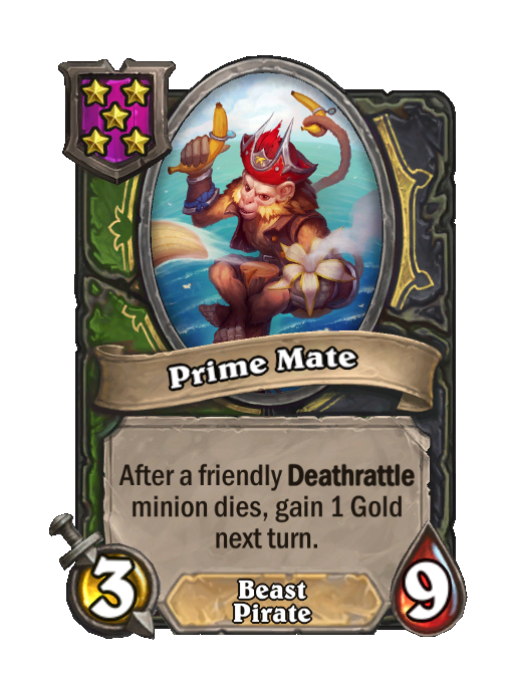 Prime Mate is a Tier 5 Beast/Pirate Minion in Hearthstone Battlegrounds with 3/9 stats. Effect: After a friendly Deathrattle minion dies, gain 1 Gold next turn. This card is no longer in the pool (Legacy).
