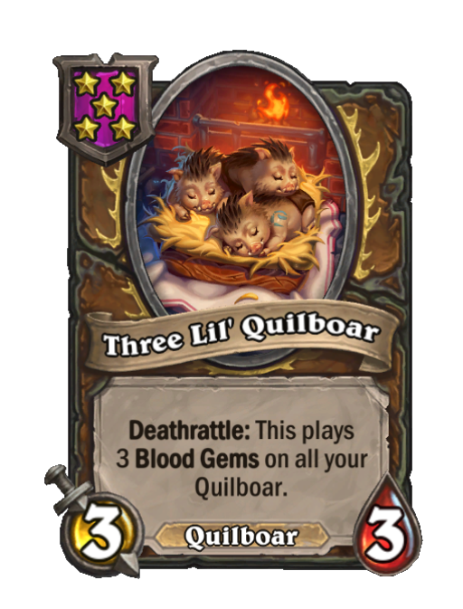 Three Lil' Quilboar is a Tier 5 Quilboar Minion in Hearthstone Battlegrounds with 3/3 stats featuring Deathrattle. Effect: Deathrattle: This plays 3 Blood Gems on all your Quilboar.