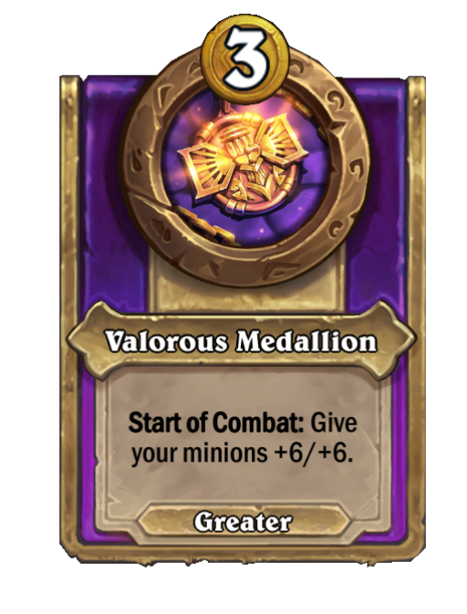 Valorous Medallion is a Trinket in Hearthstone Battlegrounds featuring Start of Combat. Effect: Start of Combat: Give your minions +6/+6. This card is no longer in the pool (Legacy).