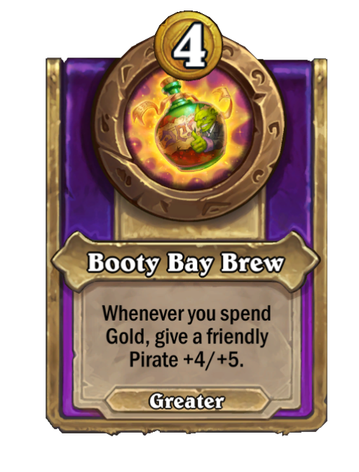 Booty Bay Brew is a Trinket in Hearthstone Battlegrounds. Effect: Whenever you spend Gold, give a friendly Pirate +4/+5.