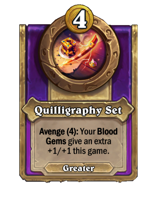 Quilligraphy Set is a Trinket in Hearthstone Battlegrounds featuring Avenge. Effect: Avenge (4): Your Blood Gems give an extra +1/+1 this game.