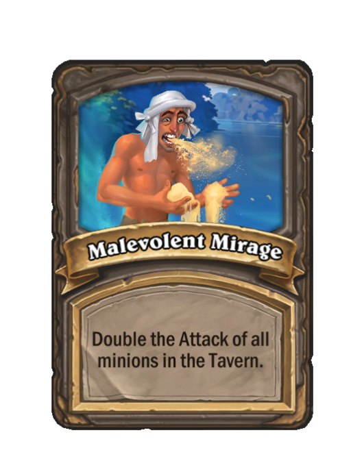 Malevolent Mirage is a Spell in Hearthstone Battlegrounds. Effect: Double the Attack of all minions in the Tavern. Created by: Mirage Conjurer. This card is no longer in the pool (Legacy).
