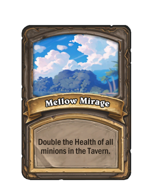 Mellow Mirage is a Spell in Hearthstone Battlegrounds. Effect: Double the Health of all minions in the Tavern. Created by: Mirage Conjurer. This card is no longer in the pool (Legacy).