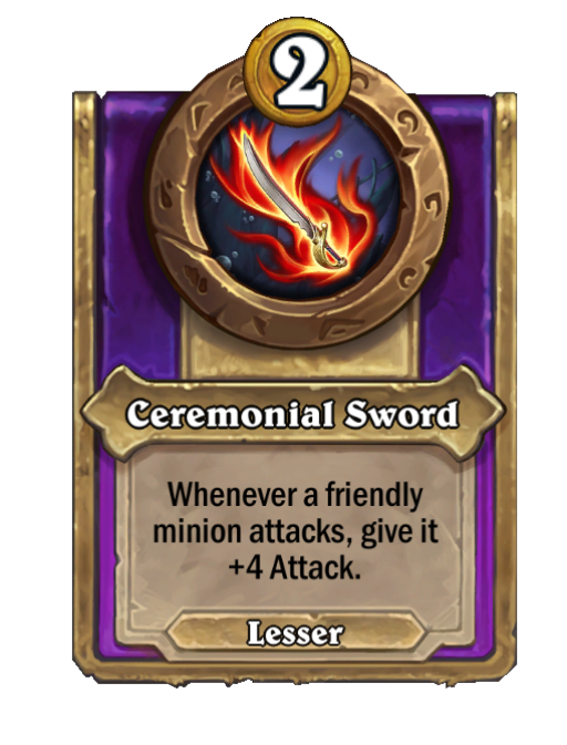 Ceremonial Sword is a Trinket in Hearthstone Battlegrounds. Effect: Whenever a friendly minion attacks, give it +4 Attack. This card is no longer in the pool (Legacy).